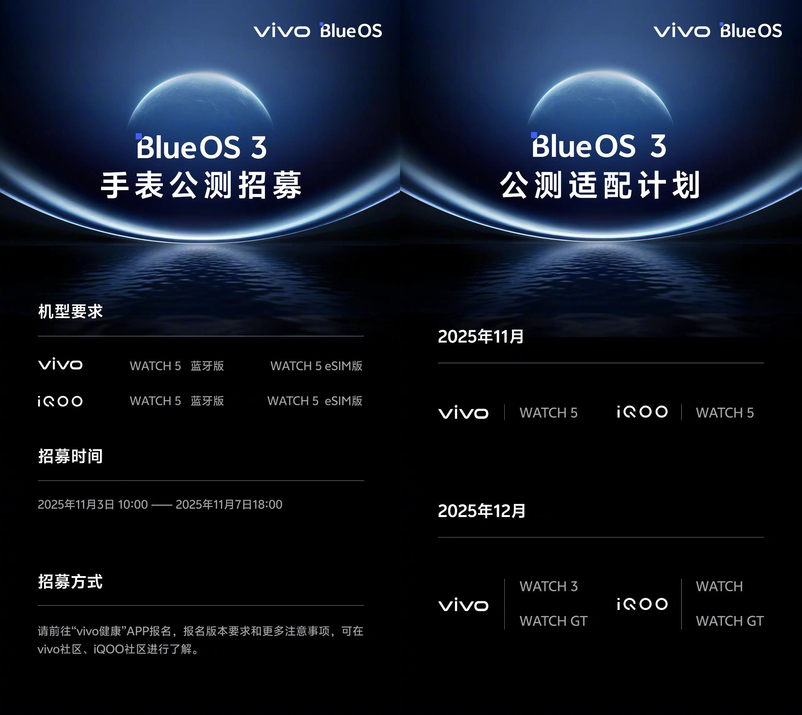 蓝河操作系统 3.0 也将逐步适配更多机型,目前已正式开启公测招募。预计 vivo WATCH 5、iQOO WATCH 5 将于 11 月开启公测,vivo WATCH 3、vivo WATCH GT 以及 iQOO WATCH、iQOO WATCH GT 将于 12 月陆续启动公测。