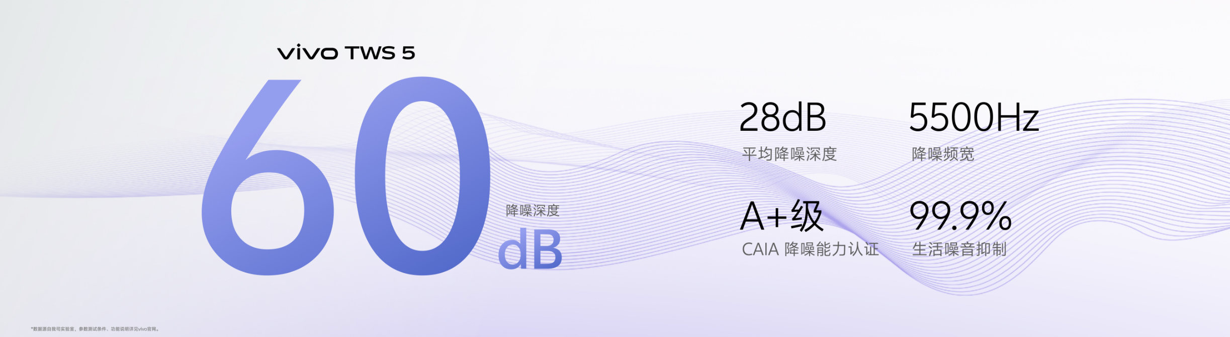 vivo TWS 5 在智慧降噪上突破新高度,智能主动降噪深度达到 60dB,宽度高达5500Hz,最高可消除 99.9% 的生活噪音。其 ANC 主动降噪系统支持四麦克风主动降噪,有效应对不同频段和强度的环境干扰,还针对飞机地铁公交三类高频场景定制通勤降噪,让你在嘈杂中尽享沉浸纯净听感。