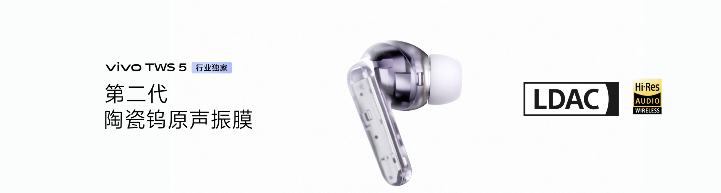 vivo TWS 5升级到第二代陶瓷钨原声振膜,采用4 重纳米镀层,具备高刚性和弹性特性,能够获得非常好的瞬态、灵敏度及瞬态响应,频响范围达到 16Hz~48kHz,细节表现更丰富。同时 vivo 金耳朵声学团队与上海音乐学院声学大师团深度共创,基于第二代陶瓷钨原声振膜优秀的声学基础,从声学结构到音频算法进行全方位精准调校,突破性地平衡了 TWS 5 声学指标与艺术主观听感。经过双方的深度调优,vivo TWS 5 的全频段能量被充分释放,从澎湃低音到清脆亮丽的高音,都能原声再现,获得了 Hi-Res Audio Wireless 高品质无线音频认证。