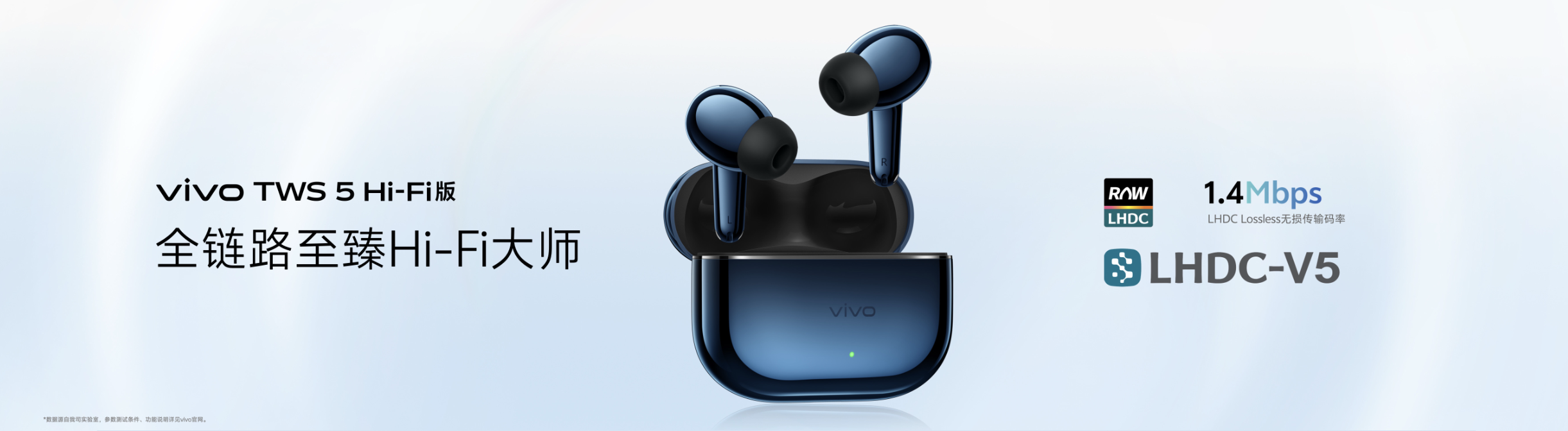 卓越的声学体验,始于无损的信号传输。vivo TWS 5 全系标配 LDAC 无损蓝牙传输协议,可实现 3 倍于传统蓝牙的 990Kbps 传输速率,从音源到耳畔的音符都能高保真还原。而在此基础上,vivo TWS 5 Hi-Fi 版则更进一步,在天玑平台实现 LHDCLossless 无线无损音频传输,带来 CD 级 48KHz/16bit的纯粹原声体验。