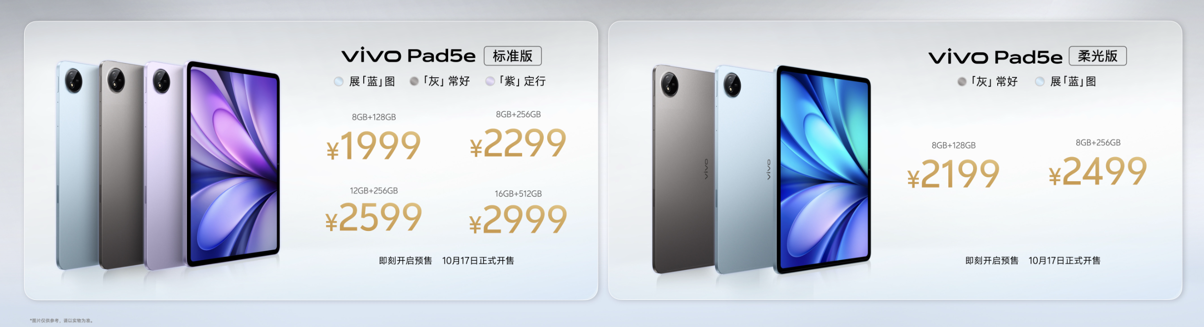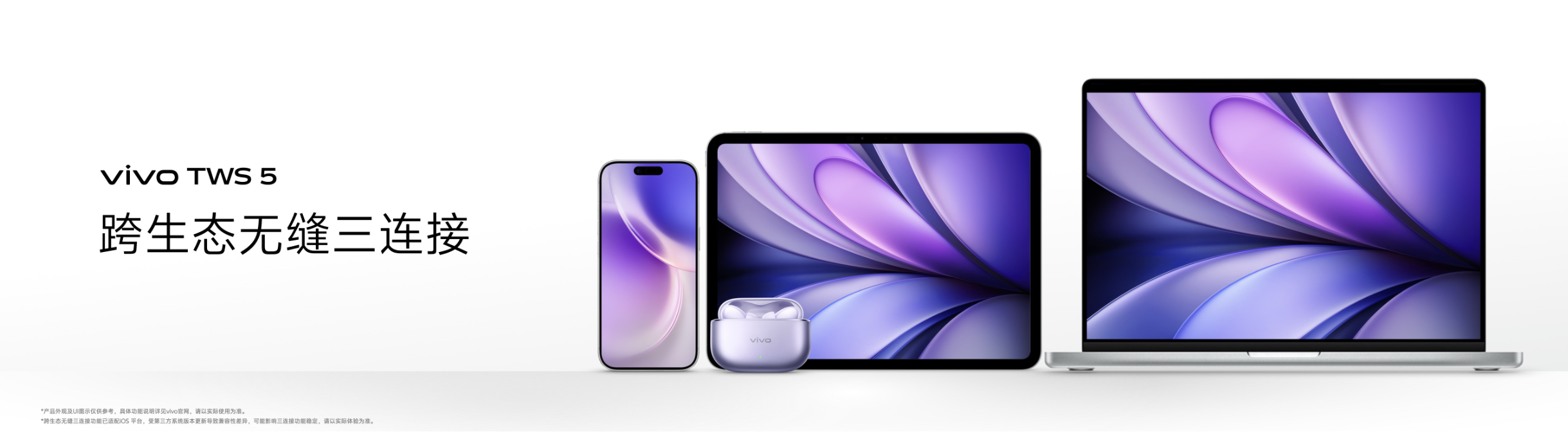 vivo TWS 5 标准版配色有“纯粹黑”、“简单白”和“微薰紫”,Hi-Fi 版配色则为“深海蓝”和“简单白”,上市价格 399 元起;vivo Pad5e 采用一体化轻薄金属机身,配色有“展蓝图”、“灰常好”和“紫定行”,提供 8GB+128GB、8GB+256GB、12GB+256GB 和 16GB+512GB 四种存储组合,还有柔光版可供选择,上市价格 1999 元起。此外,vivo 还推出组合优惠购,任意一款IoT 新品搭配vivo X300 系列购买将额外优惠 50 元,三款 IoT 新品中任意两款组合购买至高优惠 100 元。