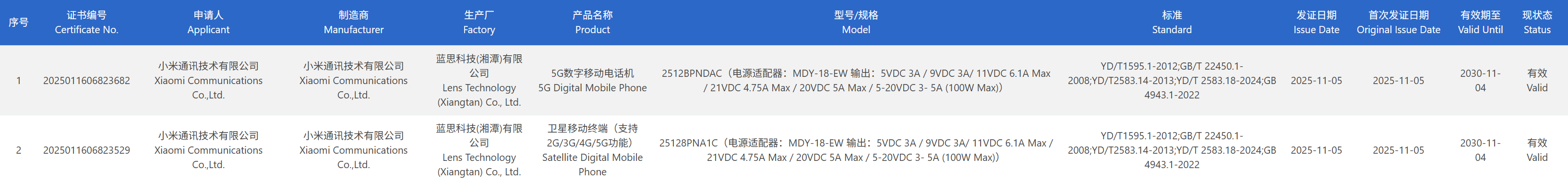 核心配置方面,新机将搭载高通第五代骁龙8至尊版平台,预装HyperOS 3.0系统。并且新机已经通过了3C认证,认证信息显示,型号为2512BPNDAC与25128PNA1C的小米新机已通过认证,其中高配版本支持天通卫星通话与北斗卫星短信功能,国际版同样确认支持卫星通信。全系机型均支持100W有线闪充和UWB超宽带技术,随着小米汽车等生态产品的完善,UWB在无感解锁、空间感知等场景的应用价值日益凸显。