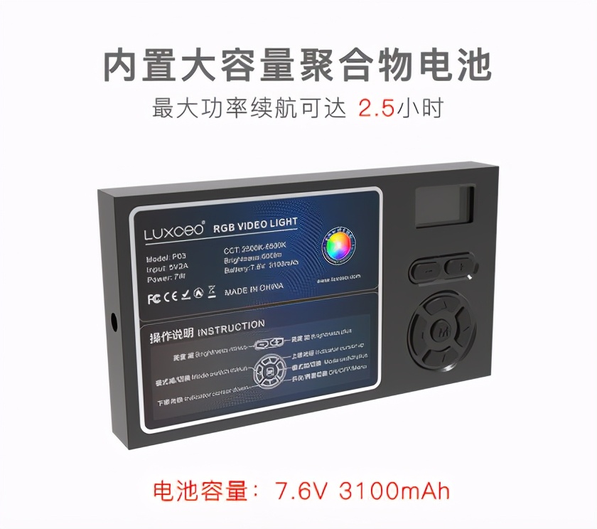 这款补光灯为充电版,内置7.6V 3100mAh大容量锂电池,最高亮度续航2.5小时,必要时也可以充当手电照明使用。