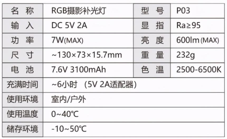 P03手持可调色温RGB全彩补光灯不仅可以作为普通的补光灯,还支持RGB模式,结合其全彩的特性有36000种灯光颜色可选择,可以根据产品拍摄视频的不同需求进行选择。