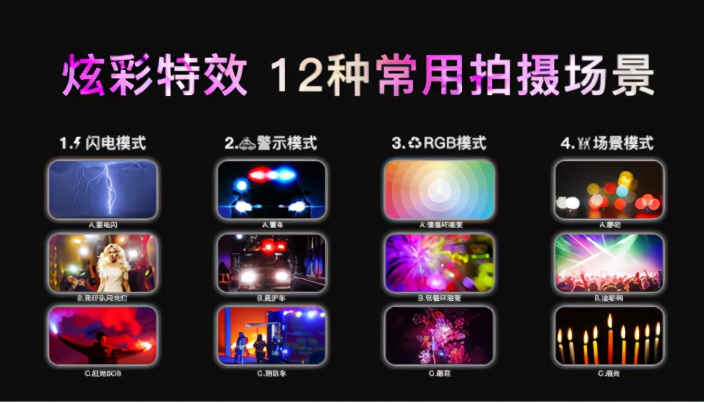 该款补光灯拥有12种特效拍摄场景,分别有闪电模式:雷电闪、狗仔闪光灯、红光SOS,警示模式:警车、救护车、消防车,RGB模式:慢循环渐变、快循环渐变、烟花,场景模式:静吧、迪斯科、炫光。可以针对摄影对象配合多彩补光创作出很有意思的作品,还可针对视频搭配出一些炫彩的特效。包括可以拍摄变化更多样的摄影作品,非常出彩。